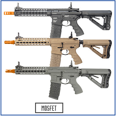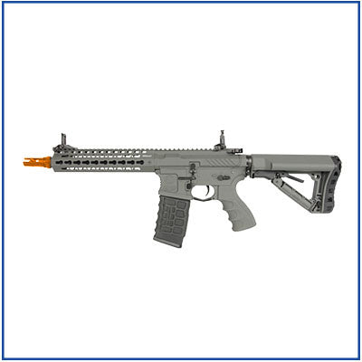 he newest evolution of the G&G Combat Machine line up takes all the standard features that everyone has come to know and respect from the Combat Machine line and improves upon it by offering upgrades and modifications that are never seen at such a low price point, and yet done to such a high level of quality. The GC16 offers an entirely redesigned full metal receiver, borrowing from the ever popular billet style that has been seen more and more in the firearms world. Other improvements include and ambidextrous magazine release, ambidextrous mock charging handle, metal keymod handguard and a selector switch with a heavy duty detent that gives the user tactile feedback when changing fire modes. While the GC16 Predator knocks other AEGs in its price range out with its agressive styling, it's whats on the inside that counts most. Installed from the factory is a MOSFET, allowing the user to use LiPo batteries without worrying about damaging the gun and a programmable fire control which allows the shooter to choose either full-auto fire , or three round burst fire modes. Loaded with features and good looks the GC16 SR series an excellent choice for any airsofter who is in the market for a gun that has all of the latest features and technology.