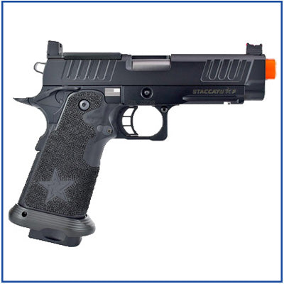 The real Staccato P is approved for duty by more than 1,300+ law enforcement agencies and carried by elite units like the Texas Rangers and the US Marshals Special Operations Group, as well as thousands of officers across the country. The P is finely crafted with wide lightening cuts at the front and rear of the slide providing superior grip while racking it back, reduced recoil and improved cycling speed. The slide is RMR ready and comes with a RMR plate for the installation of your favorite reflex dot sight. Additionally, slide comes equipped with a fiber optic front sight and a tall rear sight that allowing continued functionality when a reflex dot sight is installed. The P metal frame is a robust and nicely weighted for a more realistic look and feel and comes with an under barrel accessory rail for your favorite lights or lasers. Preinstalled is a hand-stippled polymer grip which provides a comfortable and secure hold. Other features include a skeletonized trigger and textured trigger guard continuing to provide more stability while firing. The icing on this cake is the authentic licensed logos, patterns and roll marks of Staccato.