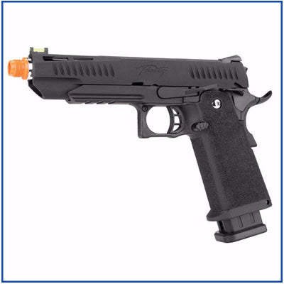 Elite Force Airsoft is proud to offer the Modify-Tech Trinity Hi-Capa 2011 GBB airsoft pistol. With a high quality metal frame and aluminum slide that ensures durability and a realistic feel, providing an authentic shooting experience every time. This Hi-Capa rocks full blowback action with a state-of-the-art green gas mechanism which offers a potent recoil simulation that closely mimics the feel of real steel. The high-capacity magazine holds an impressive 28 airsoft BBs, reducing the need for frequent reloads and keeping you in the action longer. The precision-engineered barrel allows for exceptional accuracy, making it ideal for competitive shooting and target practice. This slick blaster also features a threaded muzzle (14mm CCW), skeletonized trigger and hammer, along with adjustable hop-up, Picatinny Rail, and both thumb and grip safeties. The Trinity Hi-Capa 2011 GBB launches .20g BBs at 310 FPS. Whether you are participating in high-stakes airsoft competitions or practicing at your home range, the Modify-Tech Trinity Hi-Capa 2011 GBB Airsoft Pew Pew is the perfect fusion of style, performance, and innovation. Elevate your game and dominate the airsoft field with this exceptional handgun.