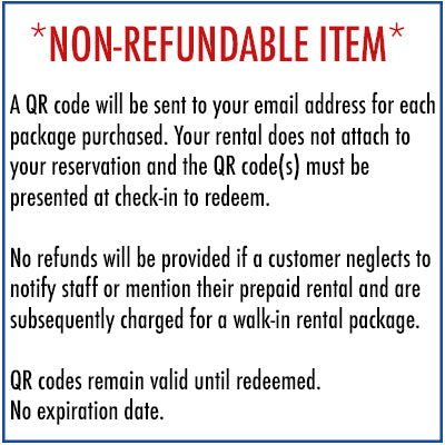 Prepaid rental packages do not automatically attach to any given reservation. It is crucial to remember to provide your QR code upon checkin to avoid being charged for any necessary rentals upon arrival if you have already purchased the prepaid option. Rental packages are nonrefundable.