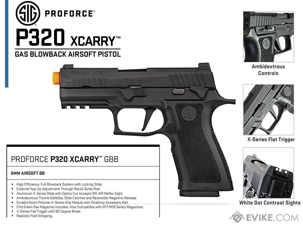 Modeled after the SIG SAUER P320 XCARRY, this Proforce airsoft pistol faithfully replicates the advanced ergonomic design the SIG SAUER™s XSeries centerfire pistols. This includes the straight blade trigger as well as the XSeries grip module with an extended beavertail and deep undercut allowing for a higher grip and improved control. Internally this airsoft pistol is also equipped with some of the most advanced features on the market. These include a fully enclosed, high volume blowbacksystem which provides a realistic cycling action and snappy recoil impulse.